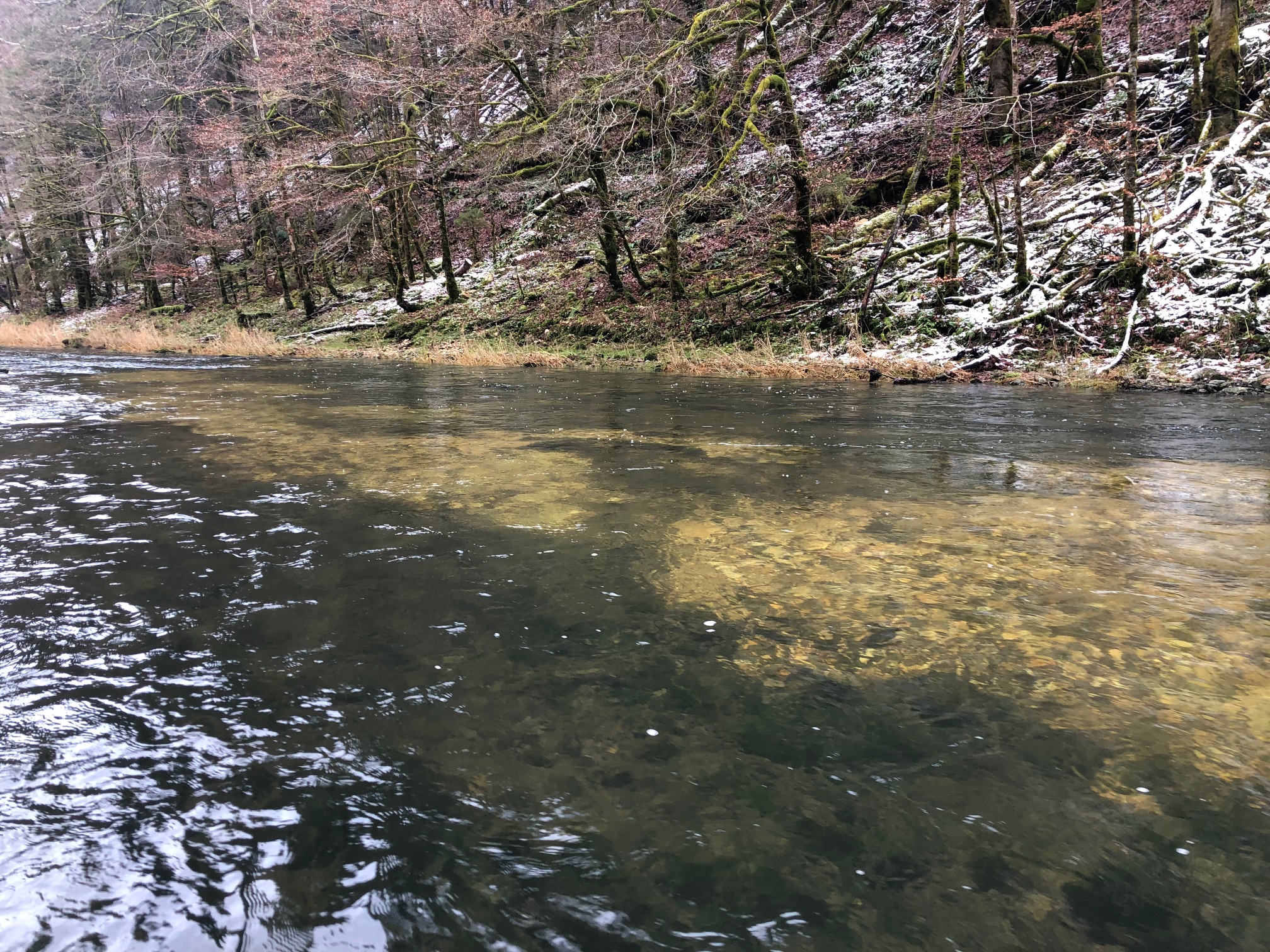Dans la rivière quelques places de frai des truites étaient visibles mais rares : taches claires au milieu d’un fond brun-vert ou noir !